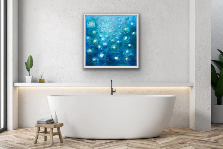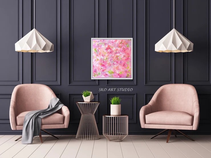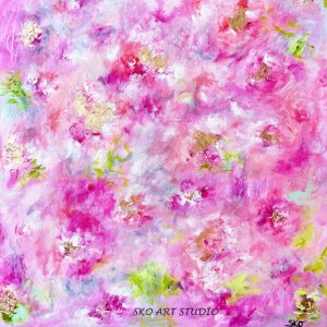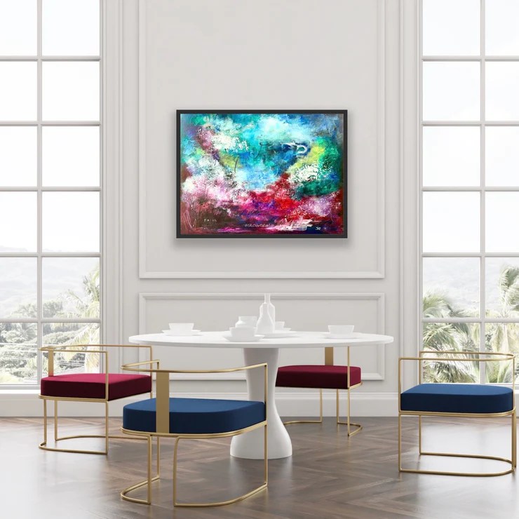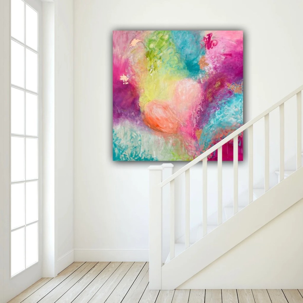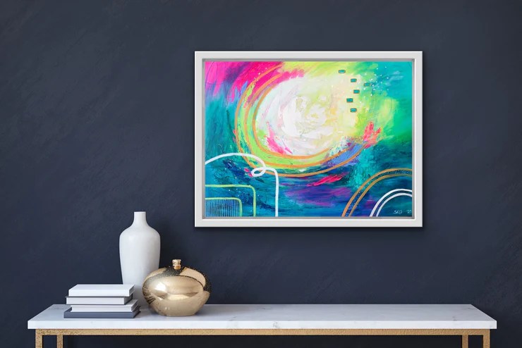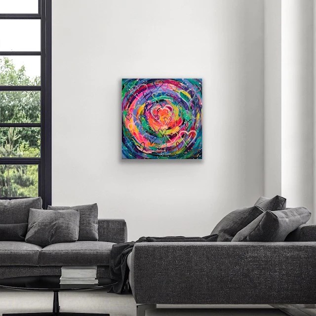 This is a vibrant painting is created with acrylic paints, and finished with two layers of resin top coat. 24″x24″x1.5″ gallery wrapped canvas. The resin truly gives depth and contemporary feel to this painting. This would make a great accent piece to any room. The sides are painted in black. This painting comes wired and ready to hang. $450