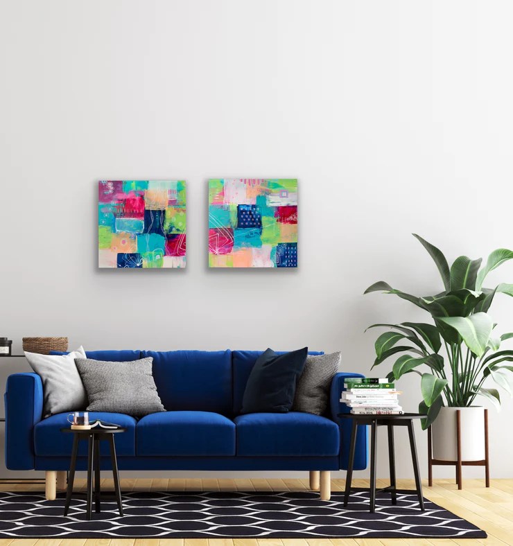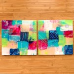 This is a 2 piece mixed media contemporary abstract is finished with a glossy durable resin top coat. Colors are vibrant and has amazing markings that connects one piece to the other. It is sold as a set. 12″x12″ wood panel. Comes ready to hang. $350