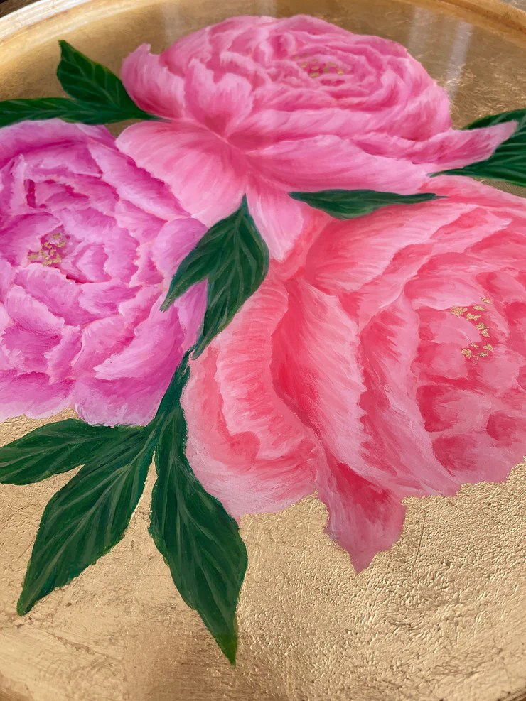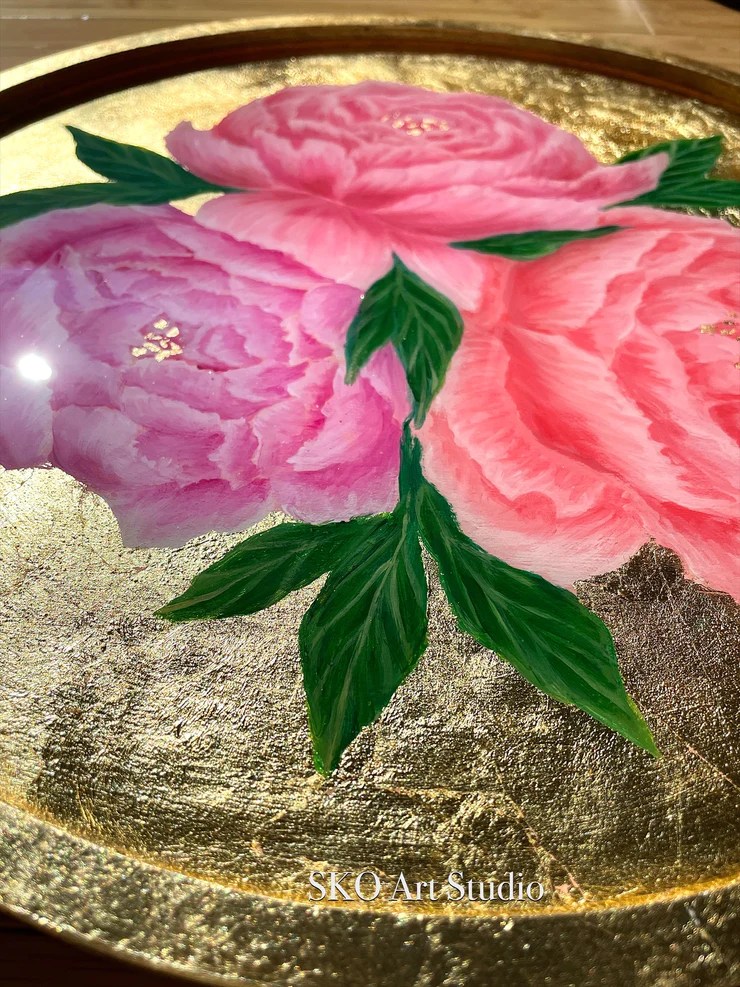 This is a multi media painting done with acrylic and gold leafing for background on a 14″ round wood panel. It is topped with two coats of resin for a glossy durable finish. Comes ready to hang on a wall. SOLD!