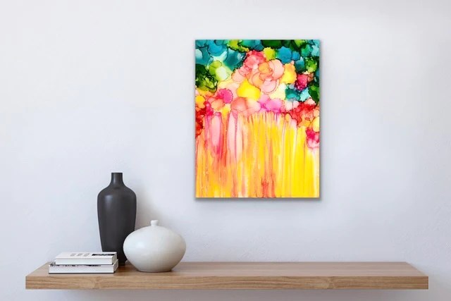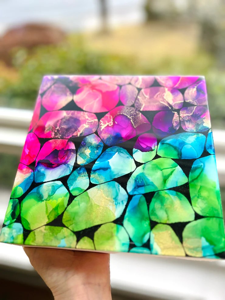 This is an alcohol ink painting on a cradled clay board wood panel. The colors are vibrant and this artwork looks great from all angles so you can turn it upside down as your preference. It is finished with resin top coat for glossiness and depth. The resin provides durability. It makes a great accent piece on the shelf or on the wall. 8″x8″x2″ and painted with black acrylic paint on all sides. $225