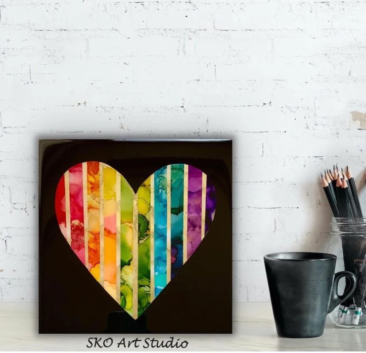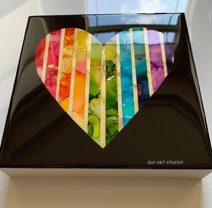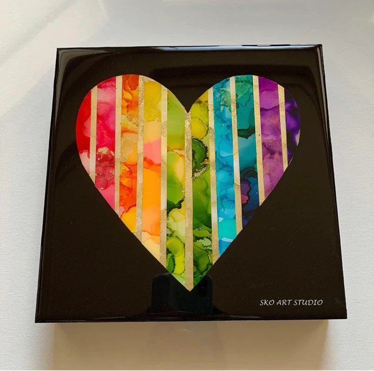 This rainbow heart painting was created with alcohol ink on yupo paper then cut into strips for a heart collage. It is on a cradled Birchwood panel finished with resin top coat. The resin gives this a durable glossy finish. It can stand on its own on a shelf or a mantle and also comes ready to hang on a wall. 8″x8″x1.5″ SOLD!
