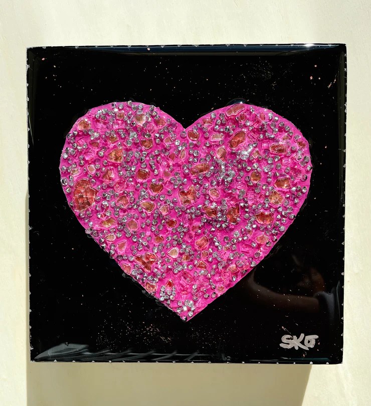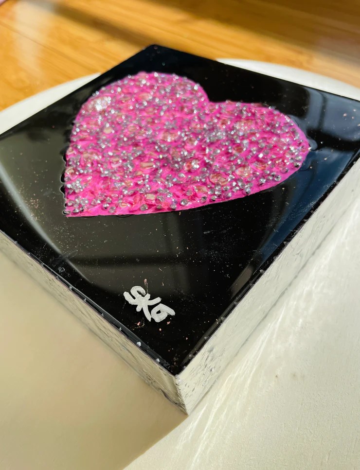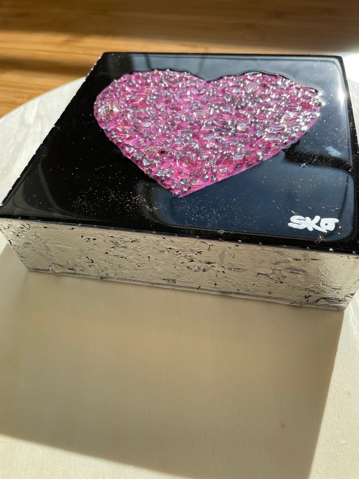 This heart painting is resined with glass pieces creating a 3D heart on a painted wood panel. The sides of the artwork is applied with silver leaf creating a vintage look. Please look at the photos closely for details. This piece looks amazing displayed on a mantle or on a shelf. Perfect as a gift for any occasions but especially Valentine’s Day. 6″x6″x1.5″ SOLD!